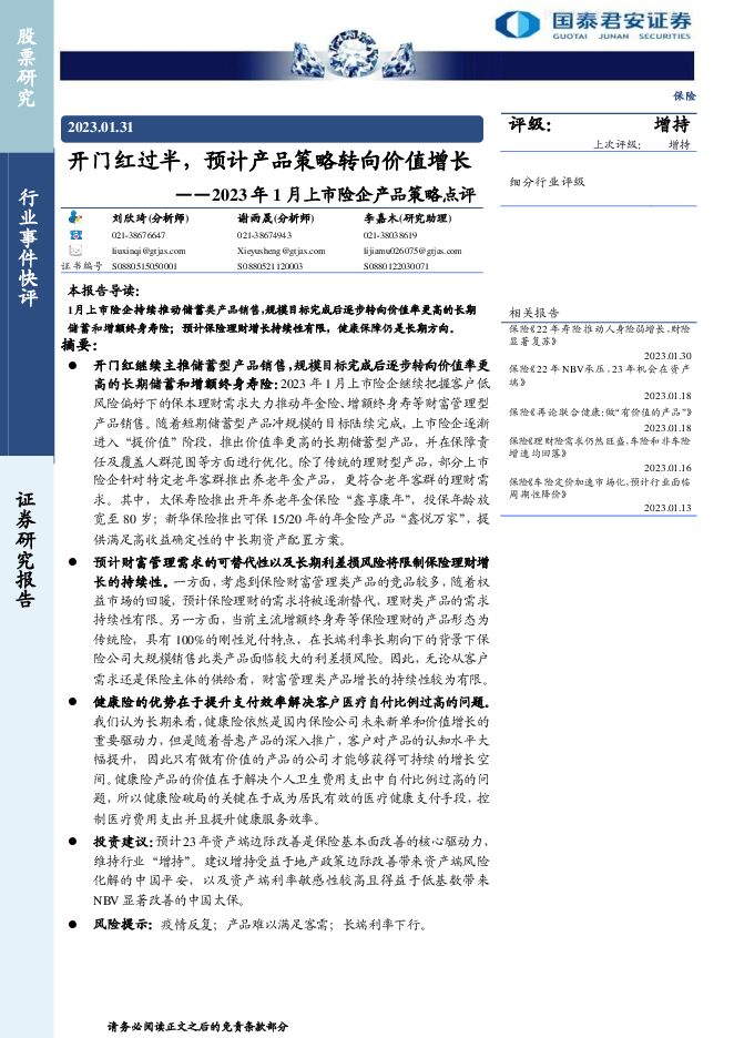 这份国泰君安证券的行业事件快评报告主要分析了2023年1月上市保险公司的产品策略,并提出了投资建议。核心观点如下: